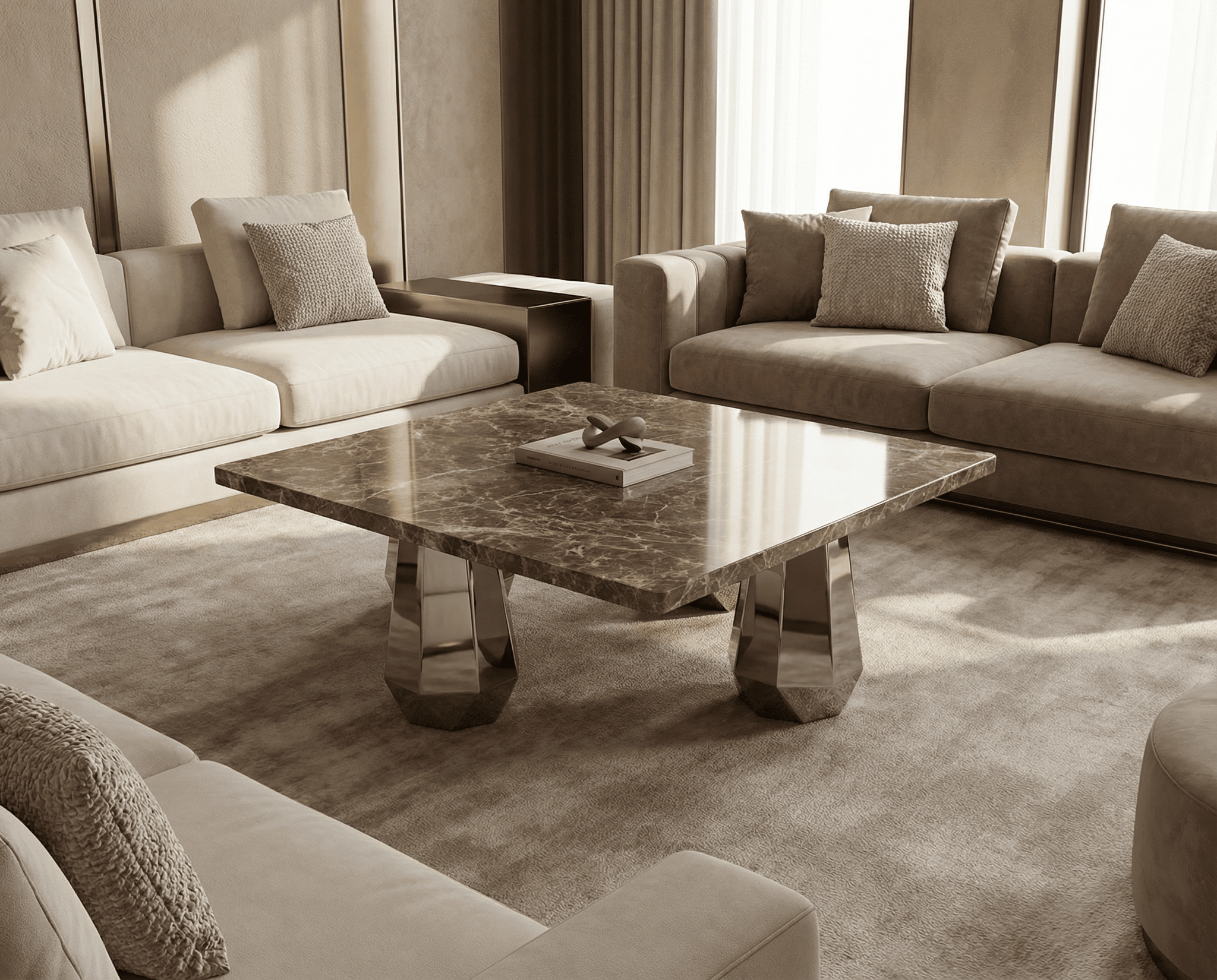 Silver Mist marble console tables showcase layered silver-gray and beige tones that create calm sophistication. Designed for modern luxury homes, these marble console tables appeal to buyers searching for contemporary stone furniture that offers balance, subtle movement, and understated elegance.
