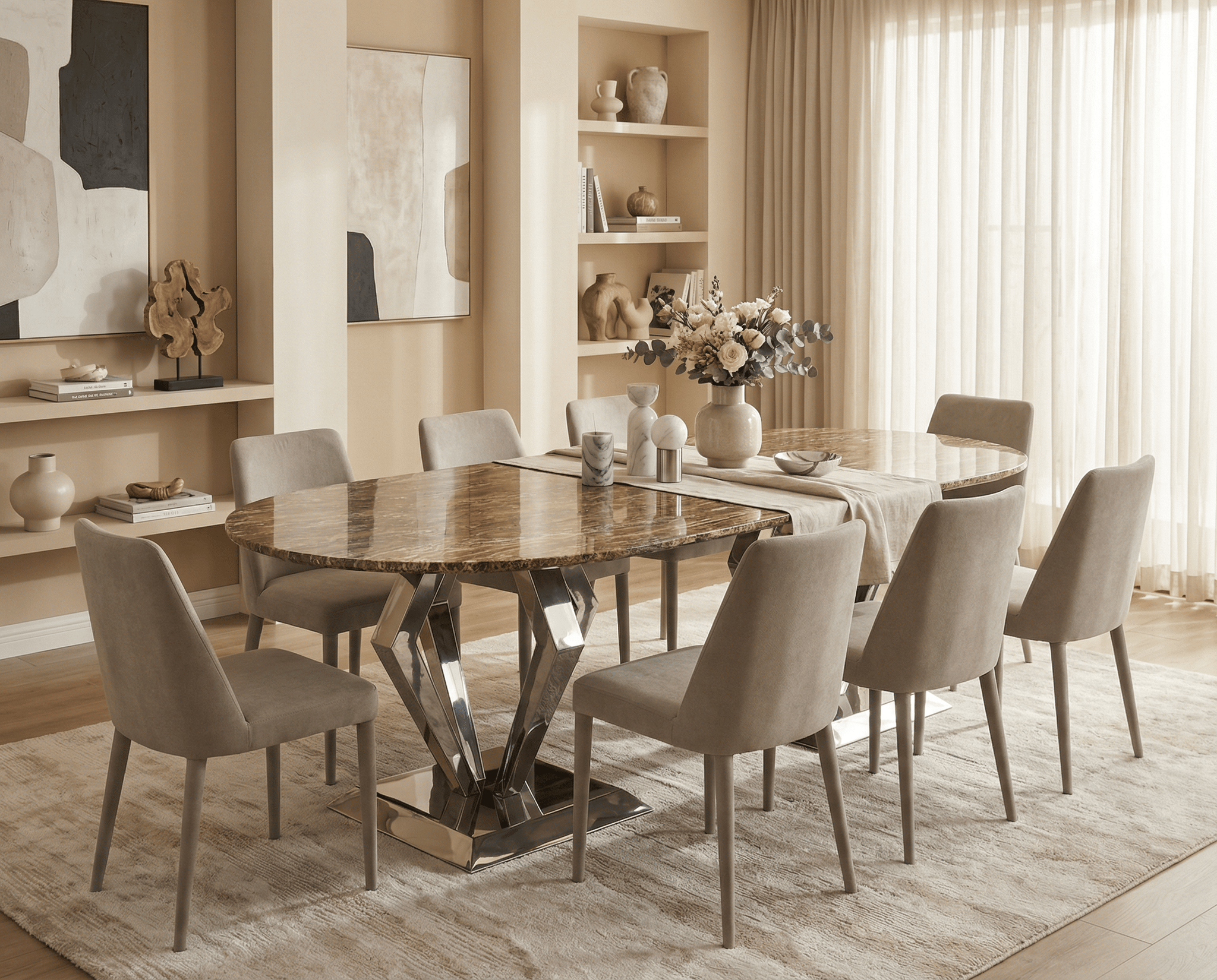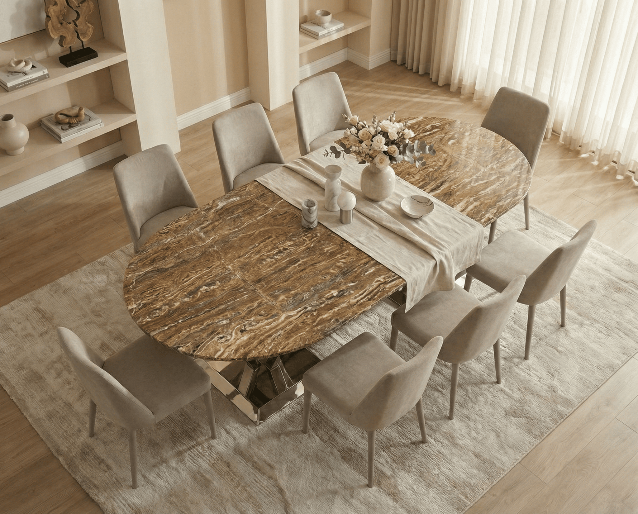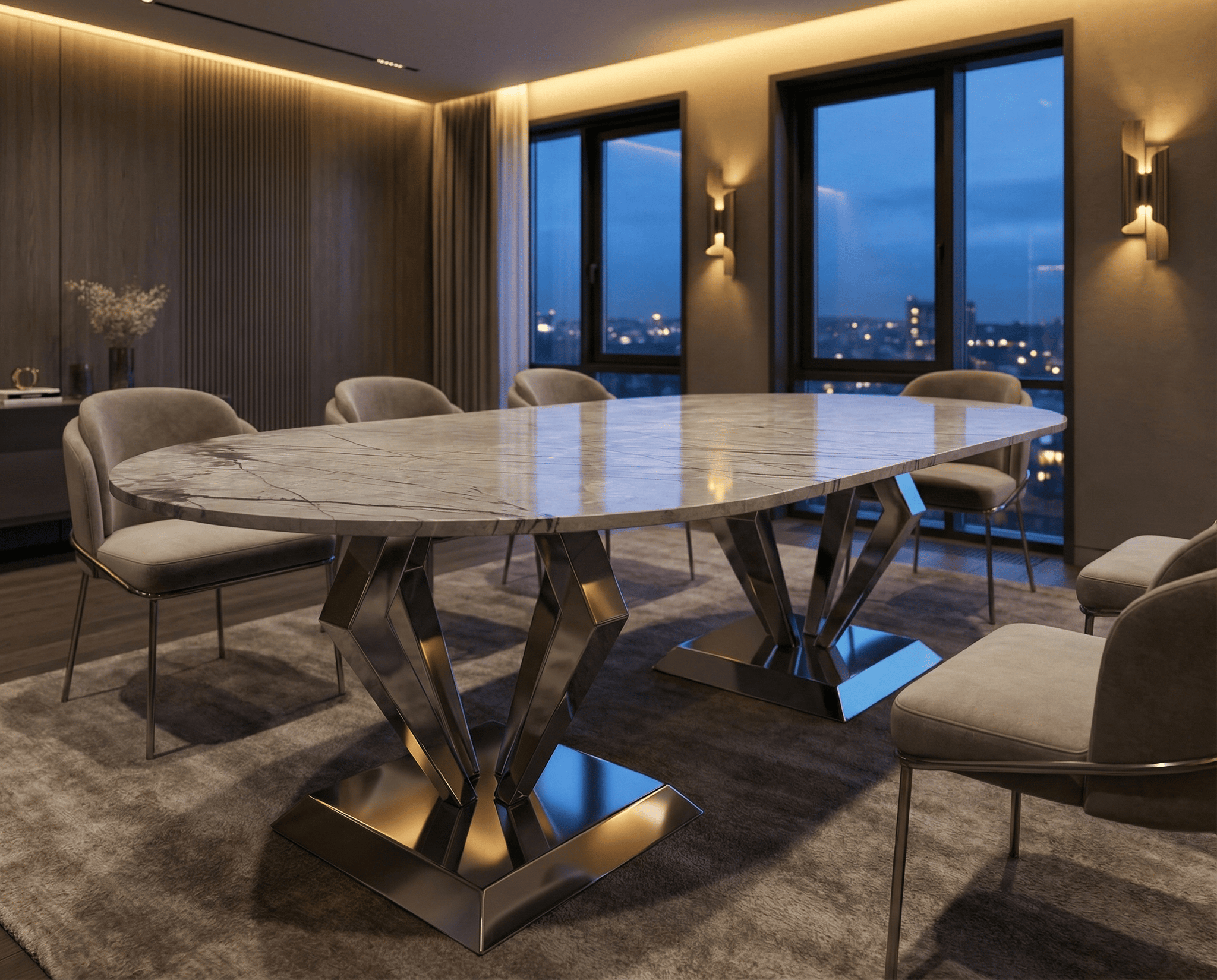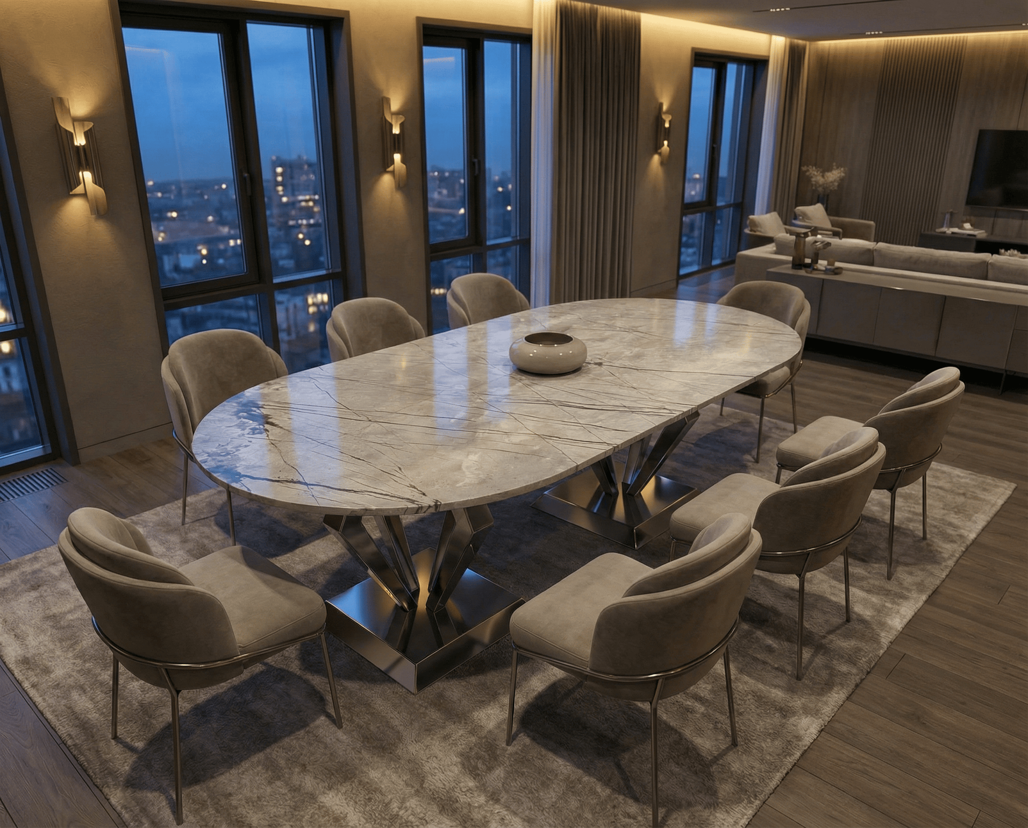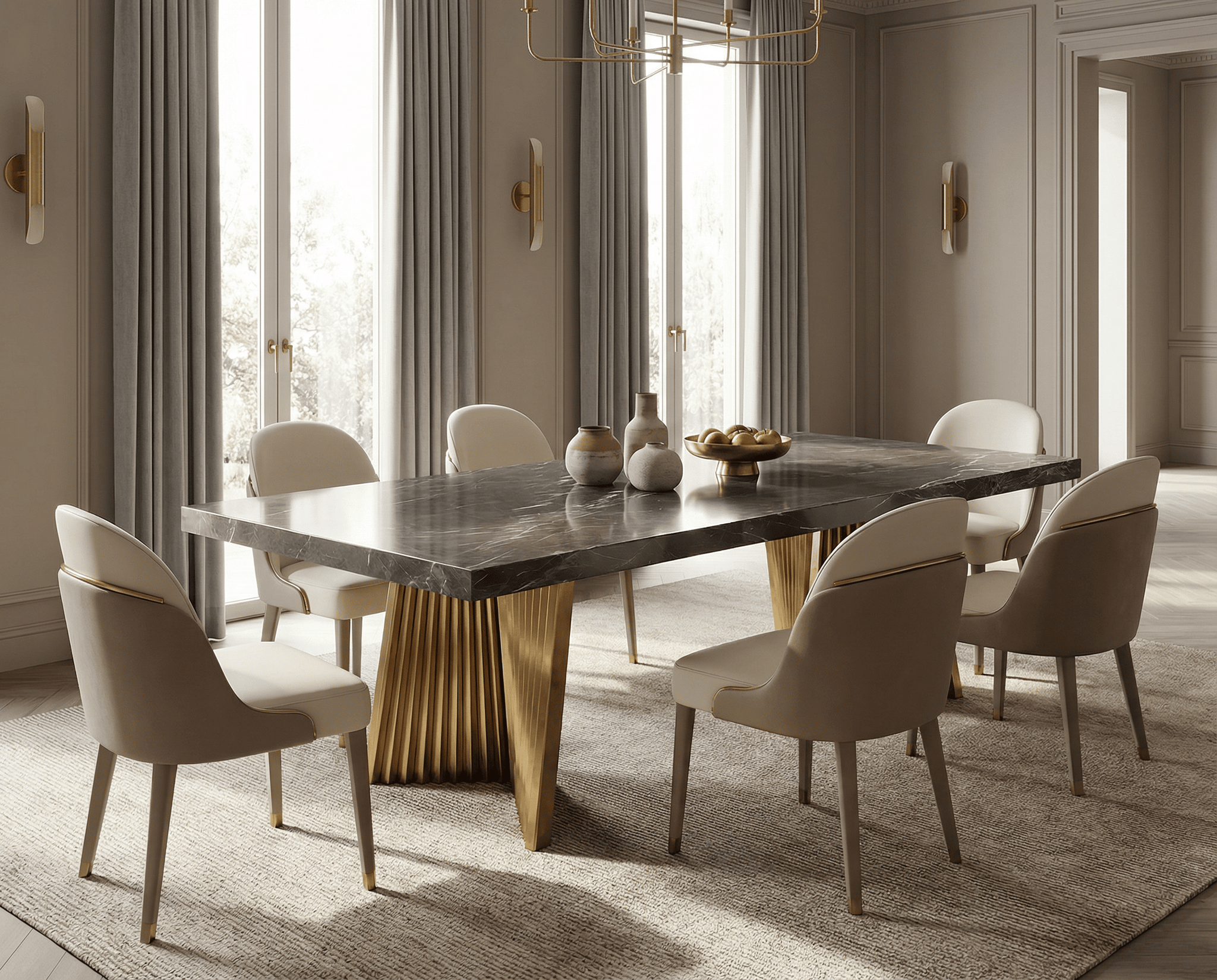 Calacatta Gold marble tables showcase radiant white stone accented with bold golden veining, creating an unmistakable luxury centerpiece. Perfect for high-end homes, these marble tables appeal to buyers searching for iconic stone dining tables that communicate prestige, craftsmanship, and timeless architectural elegance.